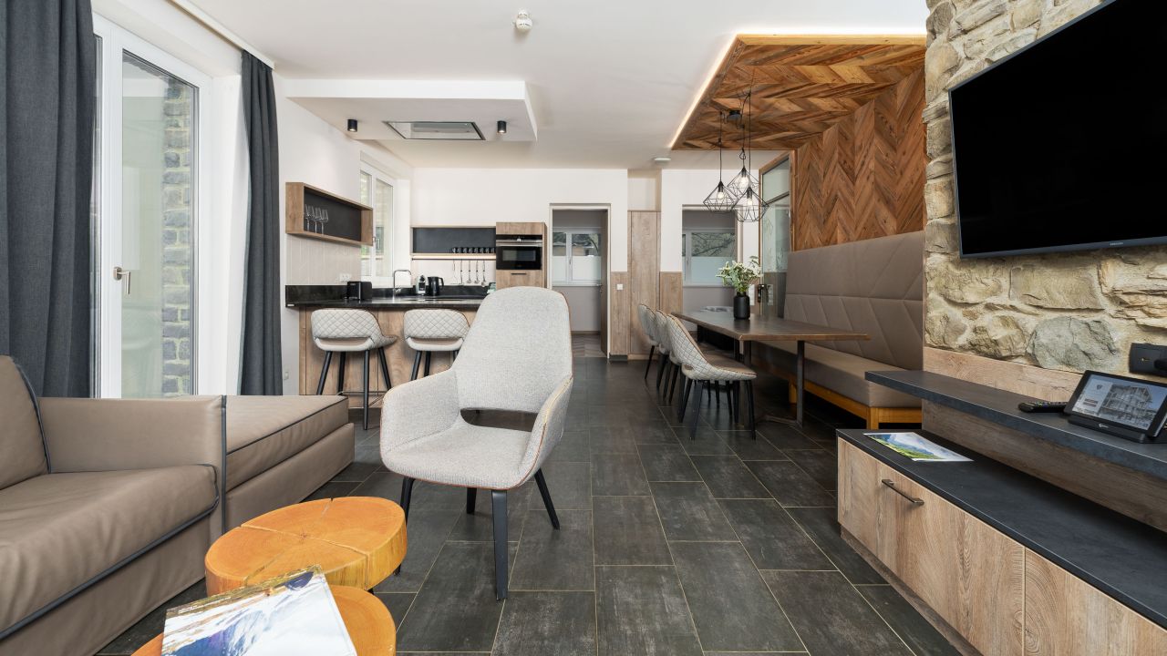Unsere modern ausgestattete Suite besteht aus drei gemütlichen Schlafzimmern und 2-3 Badezimmern mit Badewanne oder Dusche und WC. Sie bietet genügend Platz für bis zu acht Personen. Der großzügige Wohnbereich verfügt über eine voll ausgestattete Küche, einen großen Esstisch und eine Schlafcouch. Die in der ganzen Suite verbauten Holzdetails lassen Sie den alpinen Lebensstil verspüren. Vom Wohnzimmer aus gelangen Sie direkt auf den privaten Balkon, auf dem Sie entspannen können.